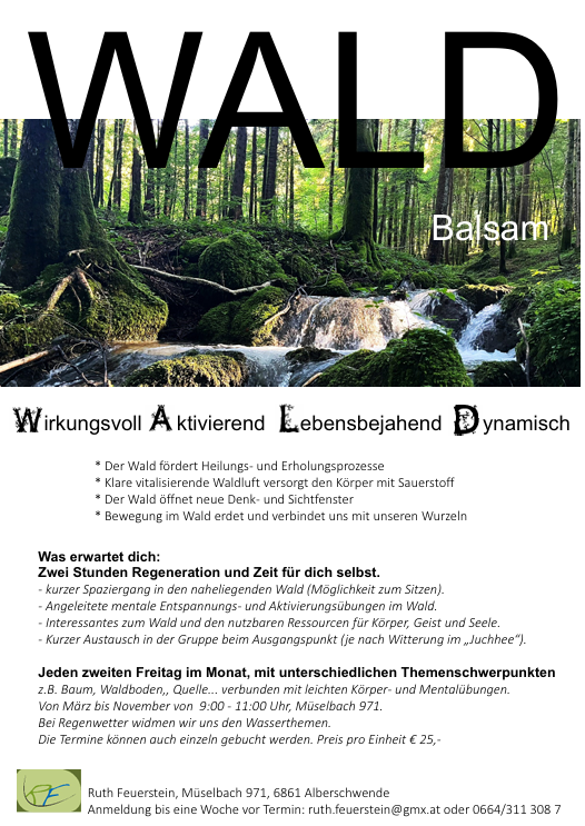 Anmeldung unter ruth.feuerstein@gmx.at oder per Whats App unter 0664 311 3087